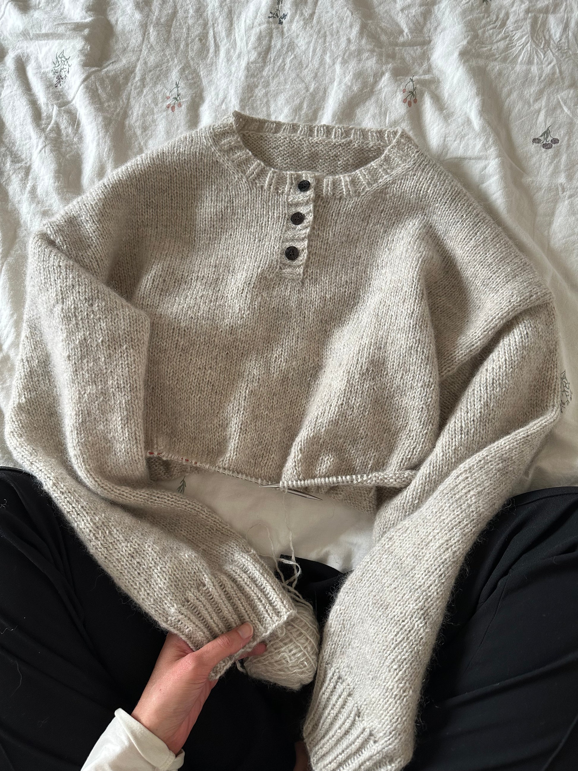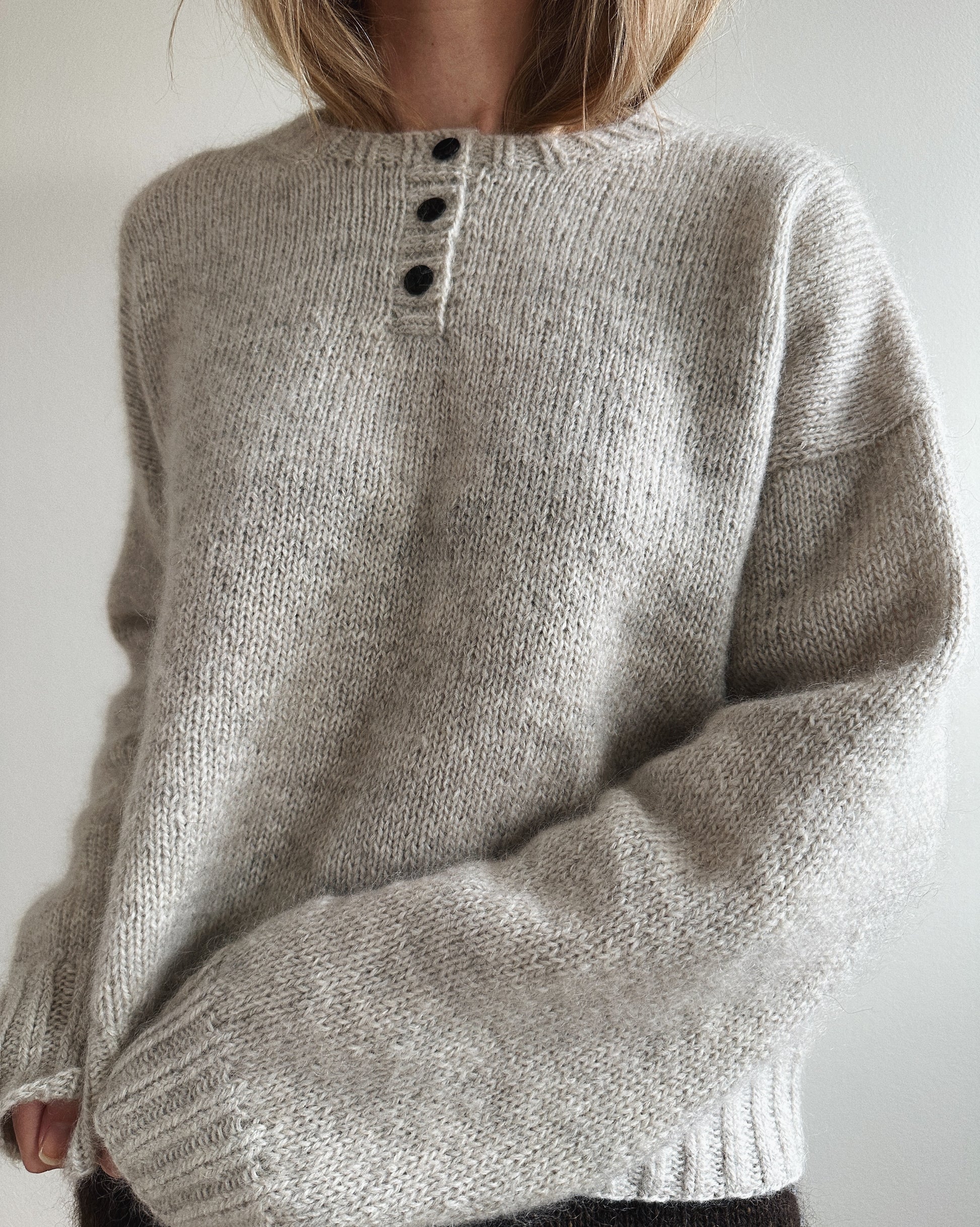 Cryo Sweater is an oversized knit with a relaxed silhouette and a classic henley button placket. The back flows smoothly into the front, creating a clean, polished shape. The result is a modern yet timeless sweater—easy to wear, with subtle details that make it special.
