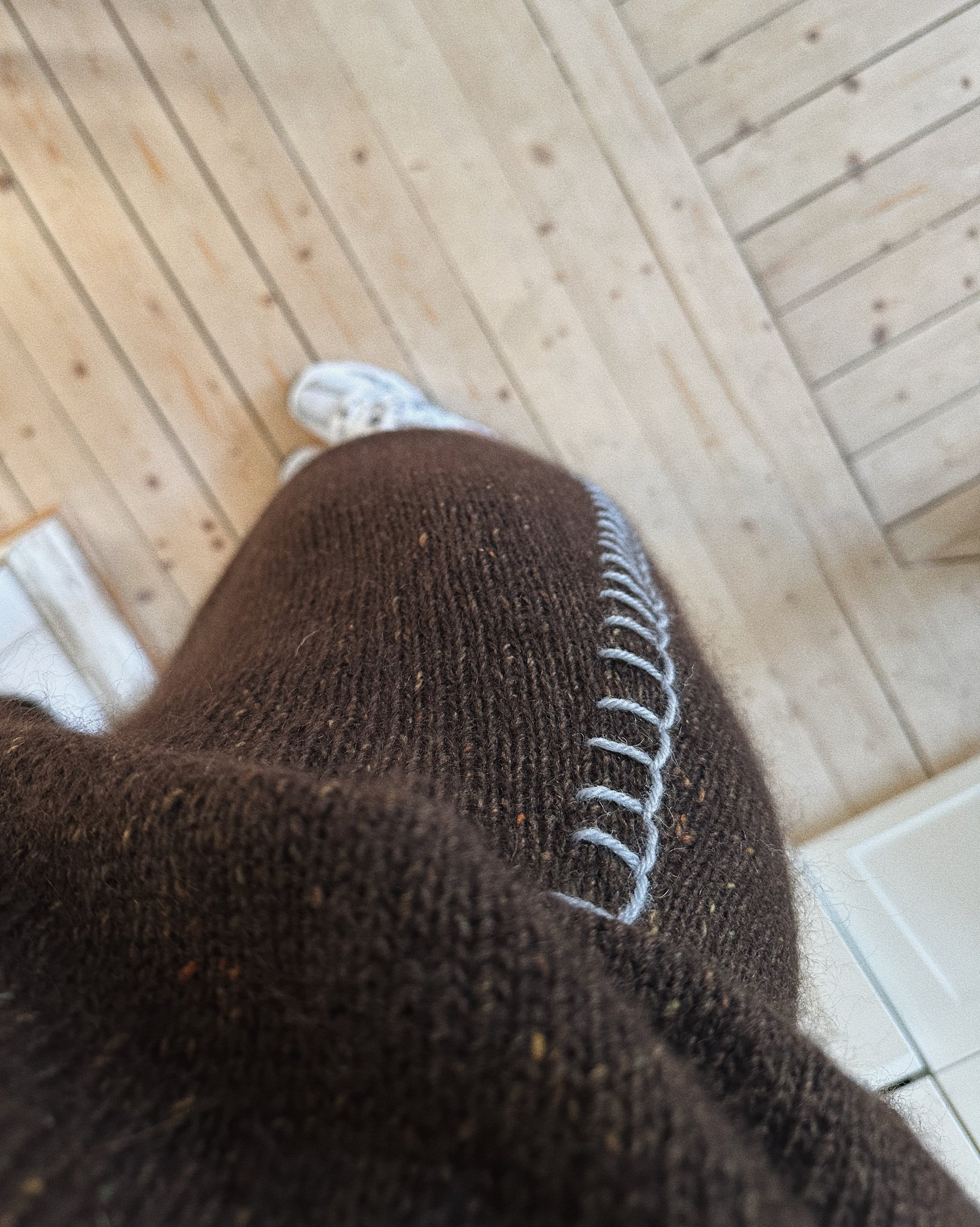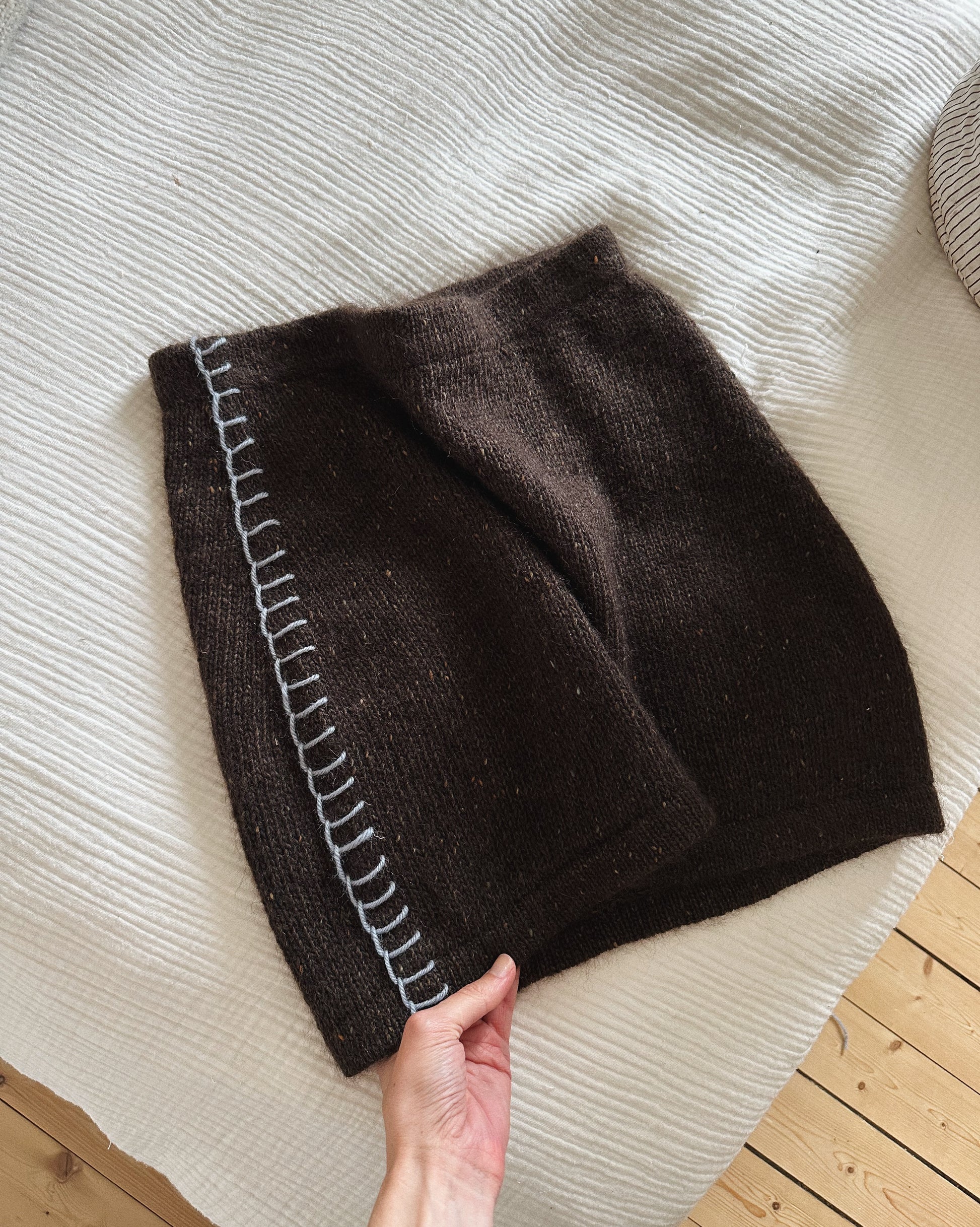 The skirt is worked from the top down. First, stitches are cast on using a provisional cast-on. A waistband is knitted, and then an elastic band is inserted at the waist. The skirt is first shaped with Japanese short rows (fully explained in the pattern), while side increases are initiated. Next the skirt is worked in the round on circular needles, with increases. The hem is finished with a double-folded edge. Finally, the decorative seams are sewn along both sides of the skirt.